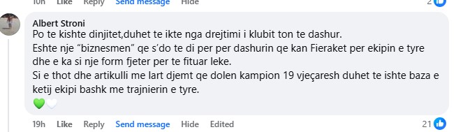 Në një koment në faqen tonë “FIERI”, ai nuk ka kursyer kritikat ndaj drejtimit aktual të klubit, duke ngritur shqetësime serioze mbi mënyrën se si po menaxhohet ekipi fierak nga presidenti Koço Kokëdhima.