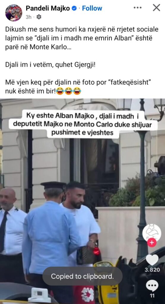 “Dikush me sens humori ka nxjerë në rrjetet sociale lajmin se “djali im i madh me emrin Alban” është parë në Monte Karlo… Djali im i vetëm, quhet Gjergji! Më vjen keq për djalin në foto por “fatkeqësisht” nuk është im bir!😂😂😂”