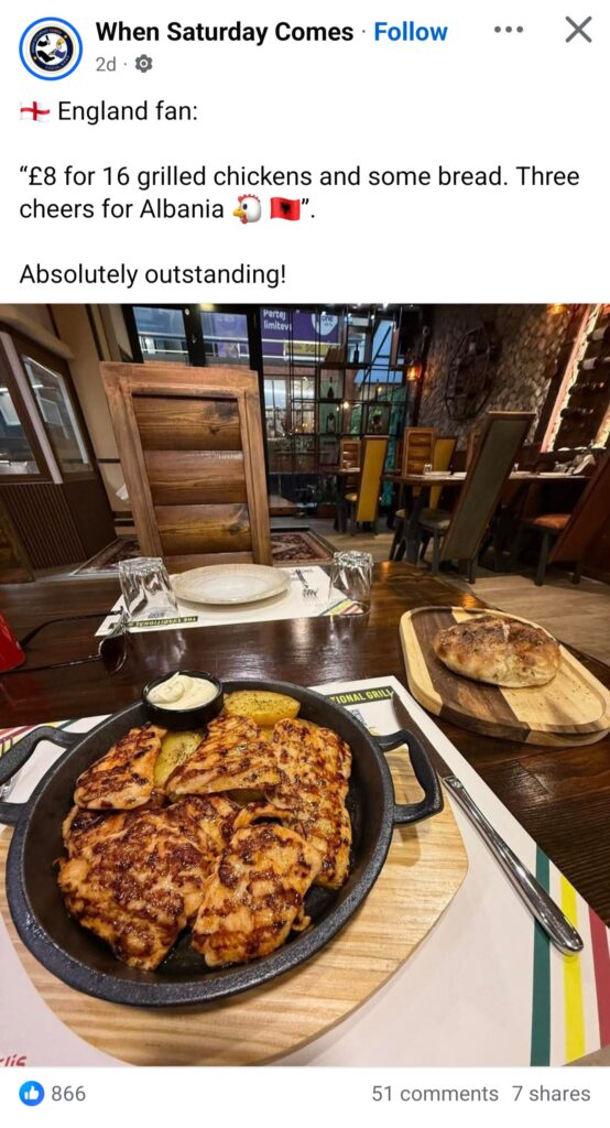 Nje faqe angleze me teme sportive ka folur per ushqimin ne Shqiperi, duke postuar nje pjate me mish pule dhe patate dhe buke te pjekur ne furre.