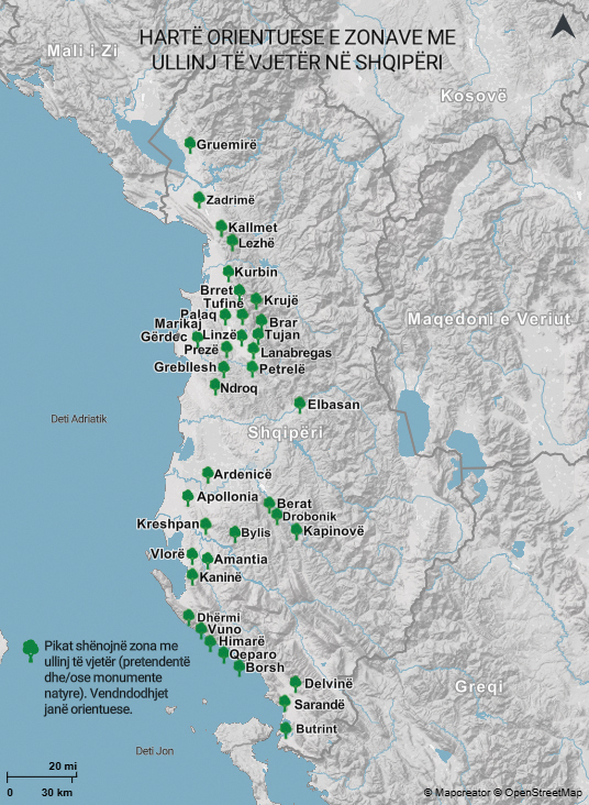 Hartë orientuese e zonave me ullinj të vjetër në Shqipëri. Pikat shënojnë zonat me ullinj të vjetër pretendentë dhe/ose monumente natyre. Vendndodhjet janë të përafërta.