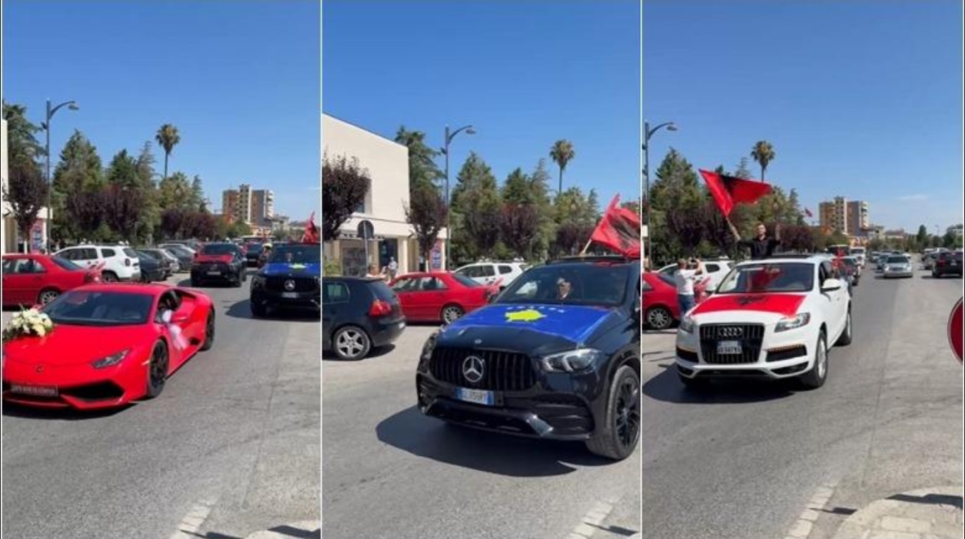 Të shoqëruar nga familjarë, miq dhe qytetarë kureshtarë, çifti ka parakaluar në rrugët e qytetit duke valëvitur flamujt kombëtarë të Shqipërisë dhe Kosovës.