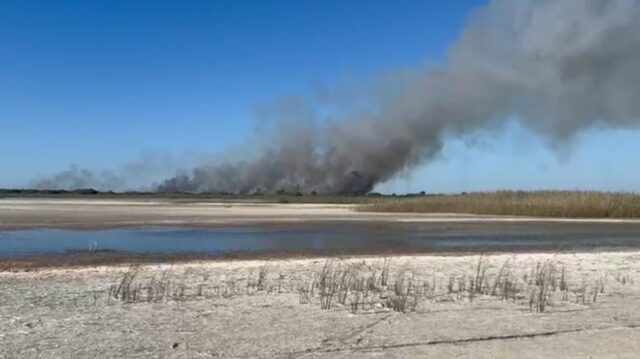 Zjarrfikësit e Fierit janë në vendngjarje, por ndërhyrja është e pamundur pasi zona ku ka rënë zjarri është e rrethuar nga uji.