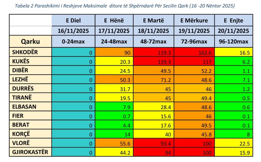 Ditën (e martë, dt.18) dhe ditën (e mërkurë, dt.19) do të ketë reshje me intensitet të lartë në tëgjithë vendin, Në qarqet Shkodër, Kukës, Lezhë, Durrës, Vlorë dhe Gjirokastër mund të ketë vërshime të shpejta të lumenjve të vegjël malorë dhe rrëshqitje të dherave. Në zonat urbane, në këto qarqe mund të shfaqen probleme me përmbytje të lokalizuara, në varësi të gjëndjes së kanalizimeve.