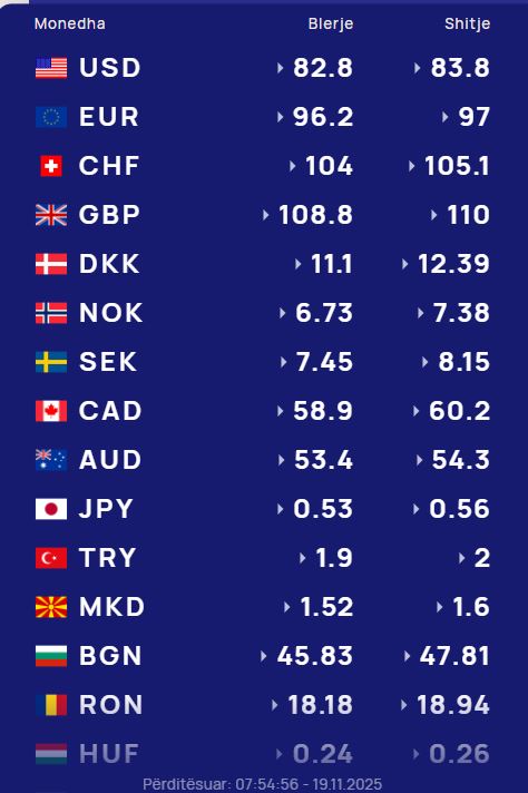 Ndërkohë monedha evropiane euro do blihet me 96.2 lekë dhe do shitet me 97 lekë.