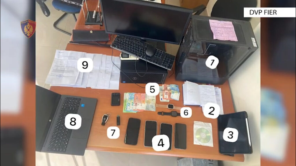 Po gjatë operacionit u gjetën dhe u sekuestruan në cilësinë e provës materiale: 50 aparate celularë, 11 njësi kompjuterike, 1 DVR, 2 hardisk, 1 automjet, 4.2 milion lekë, 28 mijë euro, 1750 dollarë dhe 340 franga. Gjithashtu, u ngrinë gjashtë llogari të kriptomonedhave, që dyshohet se janë përdorur për të kanalizuar të ardhurat nga aktiviteti kriminal.